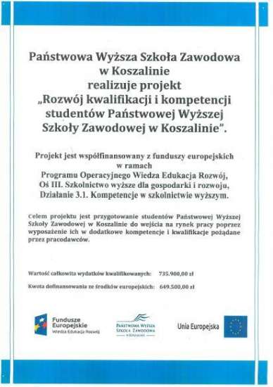 Nasza Uczelnia realizuje projekt „Rozwój kwalifikacji i kompetencji studentów Państwowej Wyższej Szkoły Zawodowej w Koszalinie” finansowany w ramach programu POWER ze środków unijnych.