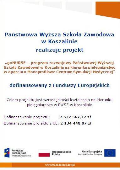 Конкурс проводився в рамках проекту «goNurse – програма розвитку Державного вищого професійного училища в Кошаліні в галузі медсестринства на базі Монопрофільного медичного симуляційного центру» – Оперативна програма «Розвиток знань та освіти», Пріоритетна вісь V. Підтримка сфери охорони здоров’я, Захід 5.3. Висока якість освіти в медичних галузях.